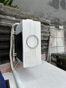 今回ご依頼いただいたのは、過去の台風通過後、1階の屋根上に設置されていた室外機が強風で横倒しになっていたという、大変危険な状況でした。