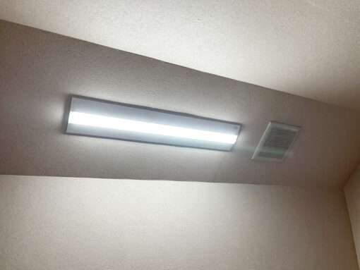 今回の電気工事では、従来の剥き出し型蛍光灯をすべて撤去し、最新のスタイリッシュなカバー付きLED照明器具へと刷新いたしました。