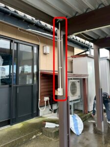 確認すると、ホームセンターで購入された電池式のセンサーライトが柱に1台ポツンと付いているだけでした。これ、実は現場を回っているとよく見かける光景なのですが、この広さに対してその小さなライト1台では、正直に言って防犯の面でも実用面でも全く足りていないのが本音です。